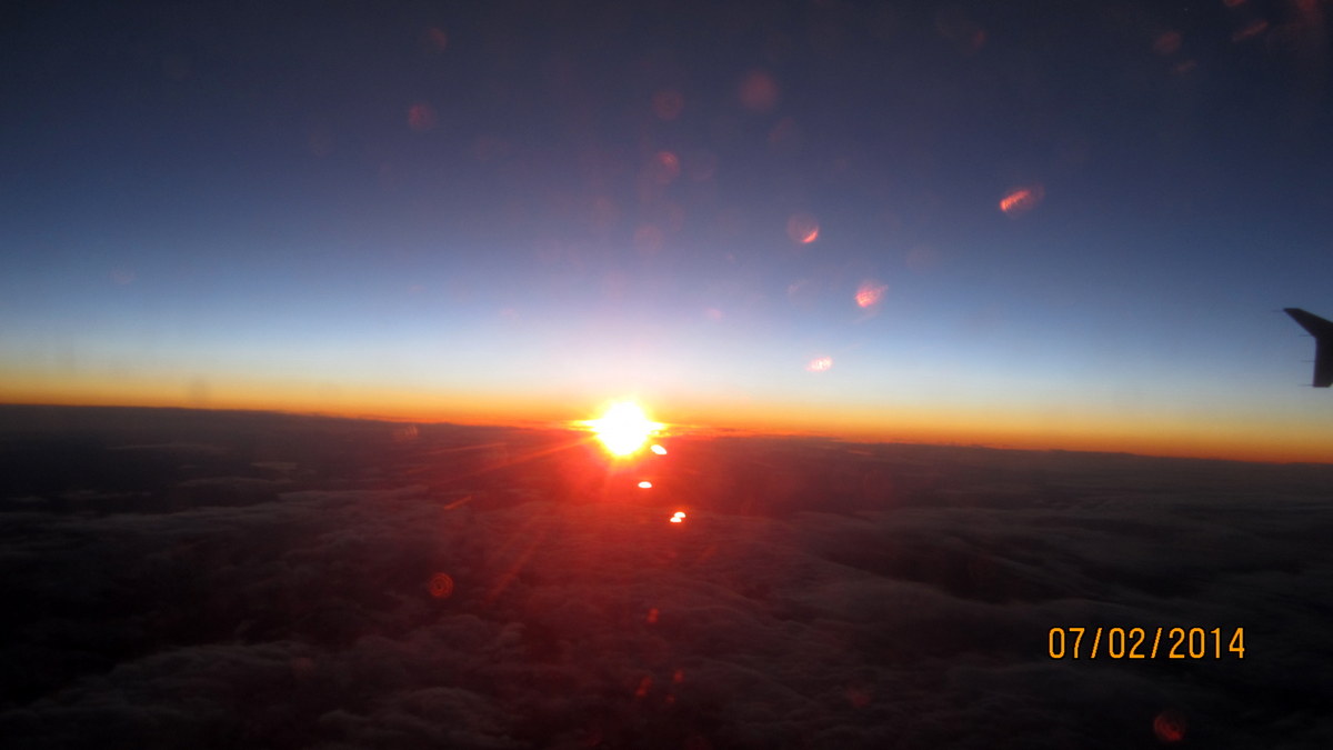 Aurinko on juuri noussut nähtynä 11 km korkeudessa Juuri ssavuttu Espanjan ilmatilaan Biskajjan lahdelta