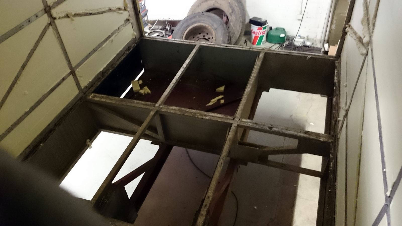 Niin.. itseasiassa jatkanpa tästä vähän vielä. Kun tämä on aluperin ollut takaa ummessa ja peräreikä on isoksi aukoksi jonkun toimesta leikattu, huomaan että jossain vaiheessa on varmaan pikkasen kolahtanut. Taka-akselin takapuolella, jossa alustan runko laskee alas ja sen päällä alumiinikorin kehikko on vähän pidemmällä jännevälillä, on tapahtunut pikku notkahdus, joka on voinut vaikuttaa myös kattoon ja varmaan onkin, koska katossa on reikä, kattoluukku, juuri sopivasti samoilla kohdilla.