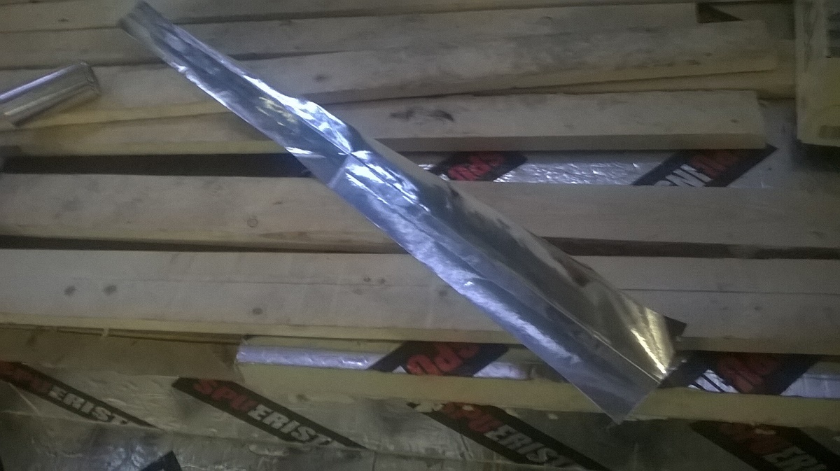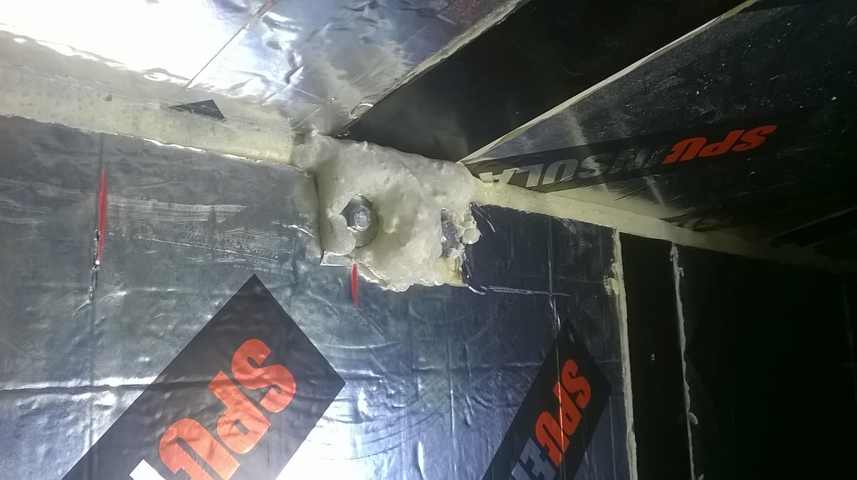 Nytte joku saattaa ihmetellä et "mikä ongelma on noissa ruuveissa"... Niissä ei sinänsä olekkaan se "onkelman ydin"... ne kestää kyllä... mutta ku mää "suuressa viisaudessani" ajattelin...(tiiättä mitä mää kädelläni teen... :D nostan sen taas virheen merkiks) no enivei... Mää siinä "älyn puuskassa" arvelin että pienennän viel tuota "kylmäsiltaa" ja ruuvasin noi soirot "villinä" pystytolppien väliin... eli noi vanerisoirot on kiinni niissä välivaakaraudoissa...ja pysty putken kohdalla on se 40mm spu-levyä... ja eriste on ohuimmillaan juurikin siinä vaakaputkulaisen kohdalla... (vähän niinku ristikoolaus) Yks huono kuva lisää... :)