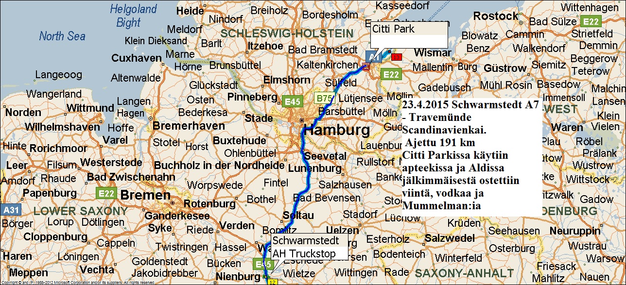 Eilen ajettiin Saksan viimeinen legi Travemünden satamaan 191 km mtkalla tankkasimme Lübekin Citti Parkissa niin että saavumme täydellä tankilla kotiin. Diesel oli hinnaltaan 1,179 €/L