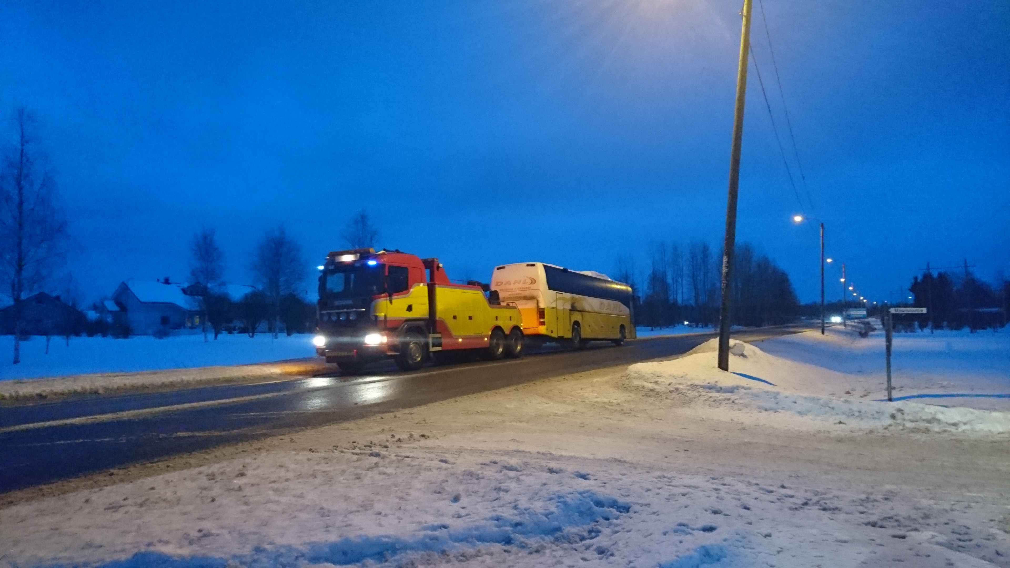 Kyllähän tuo noin turvallisempaa on kuin toisella bussilla hinaillen.