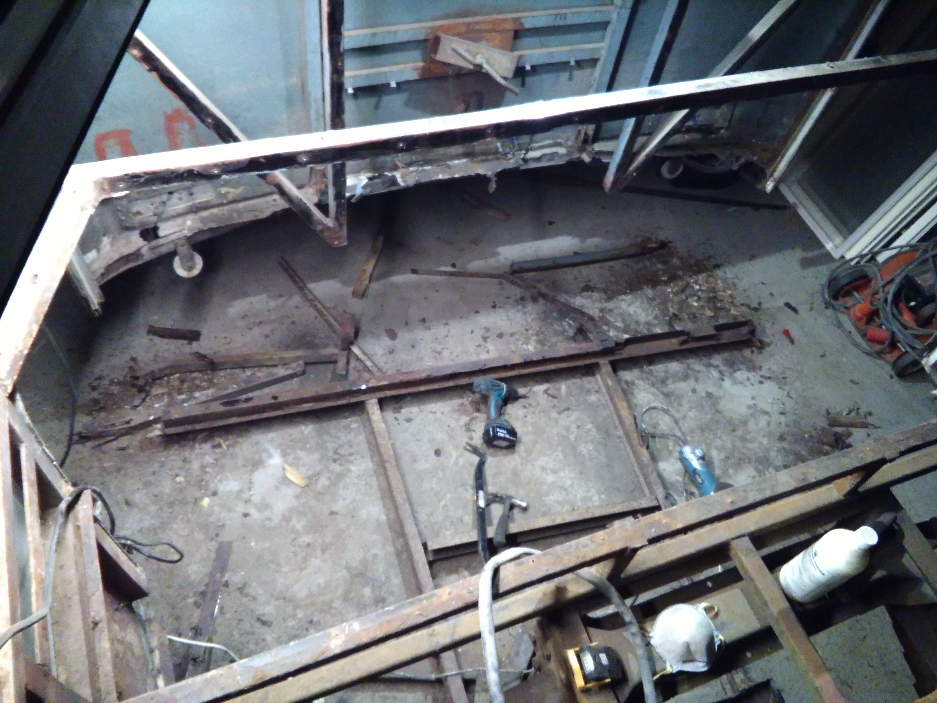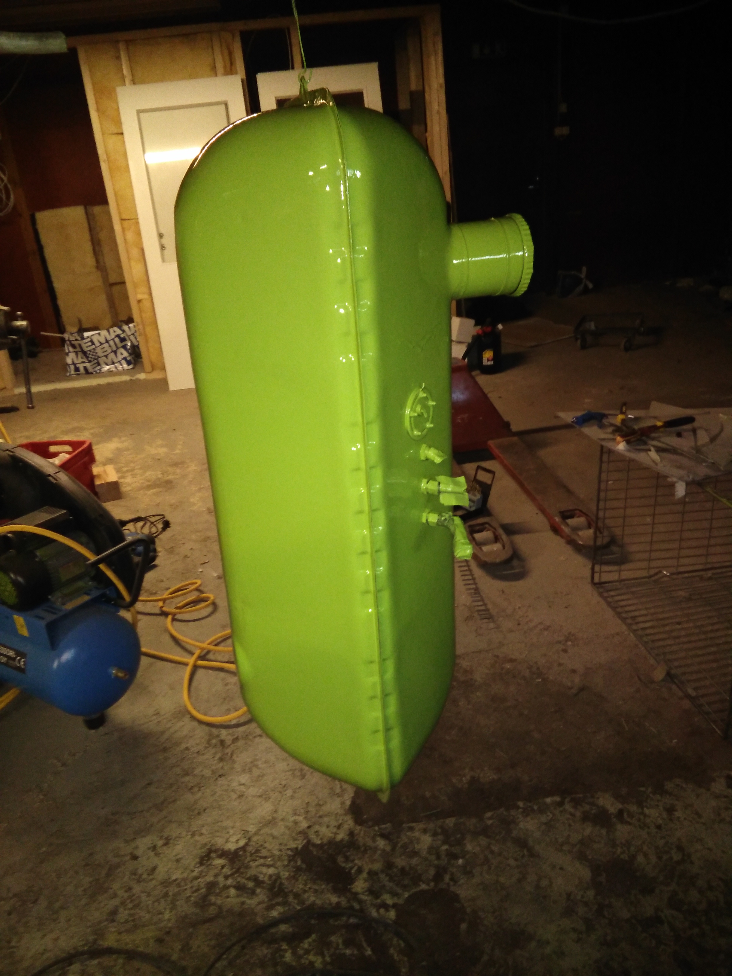 Tankki saatu lattialle putsattavaksi, toivotaan ettei armottoman paksun hiilikuitukitin alta löydy paljoa reikiä