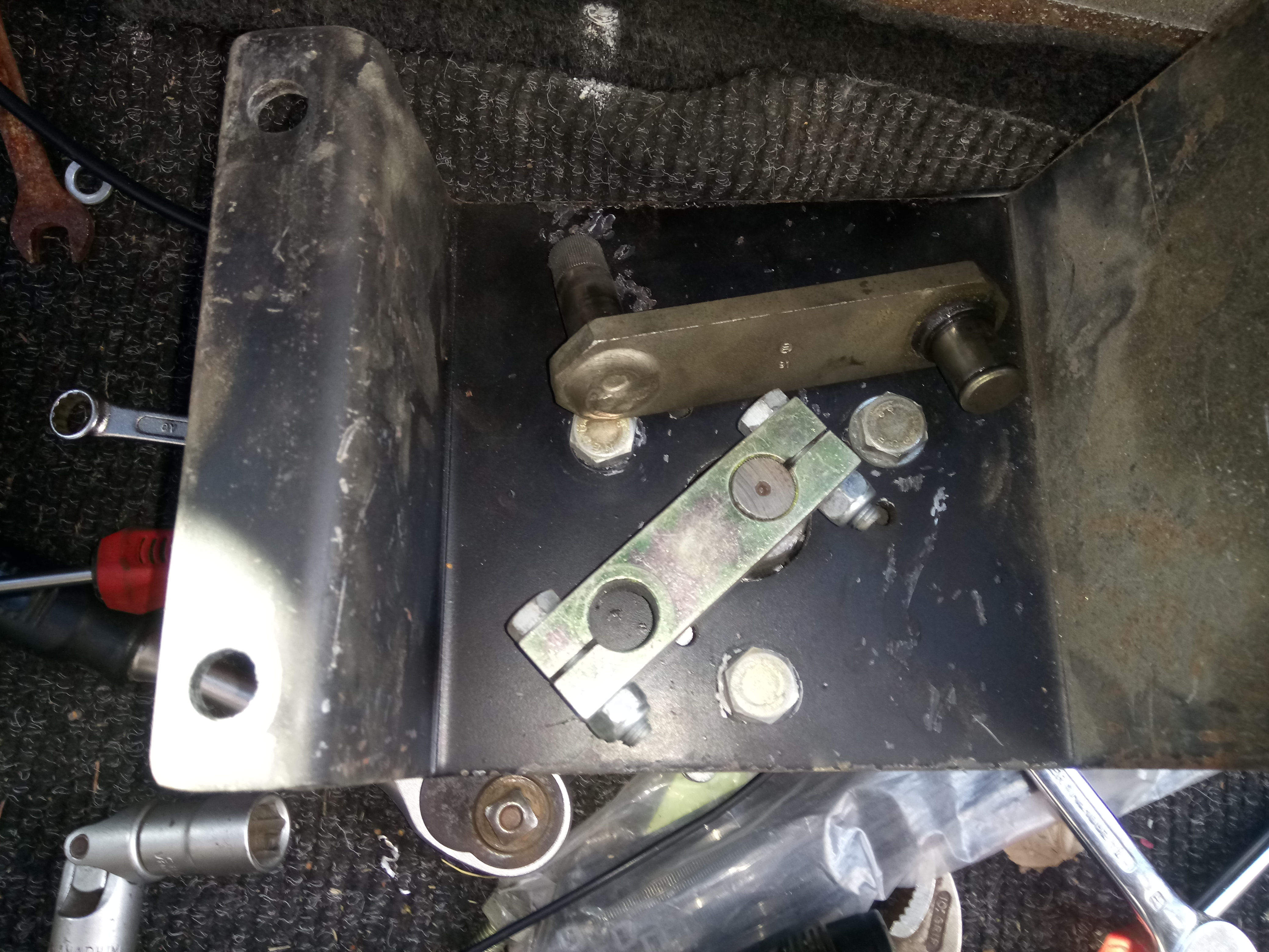 Alempi ei ollut onneks pyörähtänyt, laitoin noi kaks samaan linjaan niin tuntuis pelaavan. Todella ahdas paikka säädellä kun tuo on paikallaan, meinasin jo rälläköidä luukun auton keulaan..