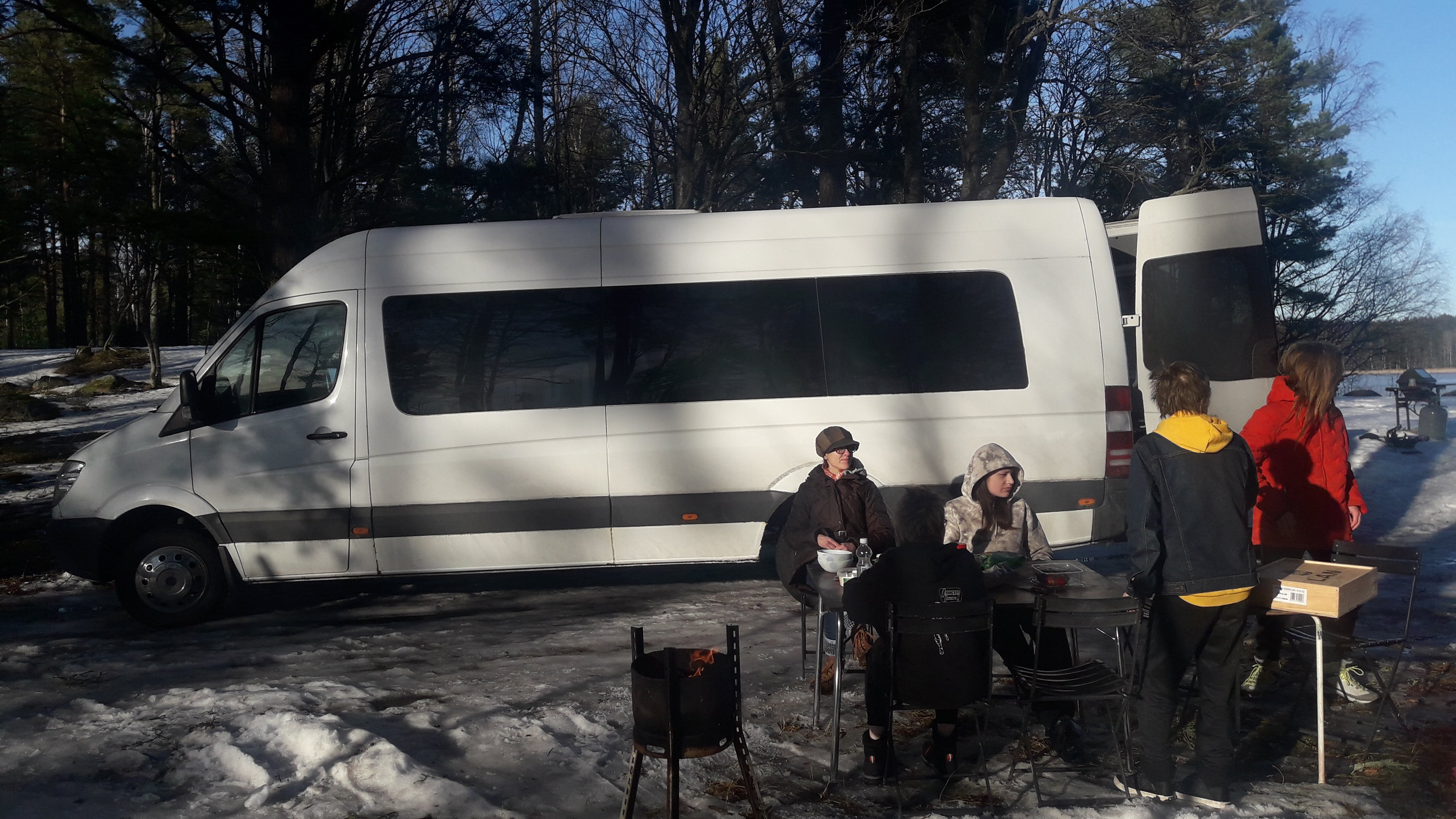 Mese on näppärä. Takakonttiin mahtuu kaksi grilliä ( kaasu sekä puu ), kaksi pöytää, 8 tuolia, eväät ja harrastusvälineet. Hyttiin mahtuisi enemmän väkeä kuin rajoitukset suosittelevat + koirat.