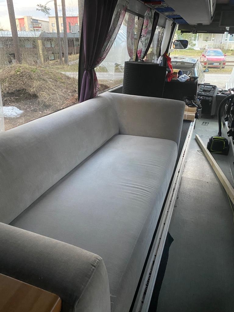 Ensimmäinen viikonloppu puuhastelua ja sisusta alkaa olla repaleena. Takaa olisi tarkoitus eristää 3:n ikkunan verran kokonaan umpeen, kattokanavat jäävät sellaisenaan paikalleen. Taakse tulee parisänky ja 2 kerrossänkyä käytävän varrelle. Etuosaan matkustuspenkit, joiden välissä tulee olemaan pöydät. Välille keittiö ja sohva oleskelua varten, myöhemmin akustot, lataukset yms, nyt kuitenkin täytyy saada reissukuntoon, eli sängyt ja keittiö ensin.