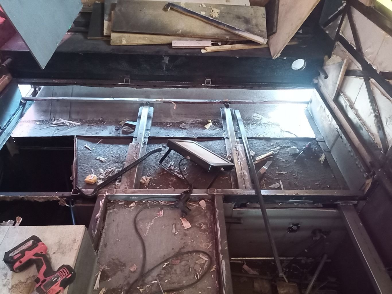 Tuolla takaosan pellin alareunassa, n. 20 cm uuden lattiatason yläpuolella näkyy paikat, mihin meni auton pituussuunnassa 30*30 mm ohutseinäputket. Nämä oli hitsattu vain alareunasta kiinni tuohon peltiin, bonuksena noiden kantattujen peltien väliset hitsit oli ratkennut irti tuon rungon kohdalta. Loppuosan rungosta muodostivat erilaiset nitomalla toisiinsa kiinnitetyt vanerisoirot, oli kai joissain väleissä liimakin, ainakin uutena ollut... Uudesta rungosta taisi tulla liian hyvä, notkuu jalan alla vähemmän kuin alkuperäinen, vaikka tästä puuttuu vaneritkin viel.