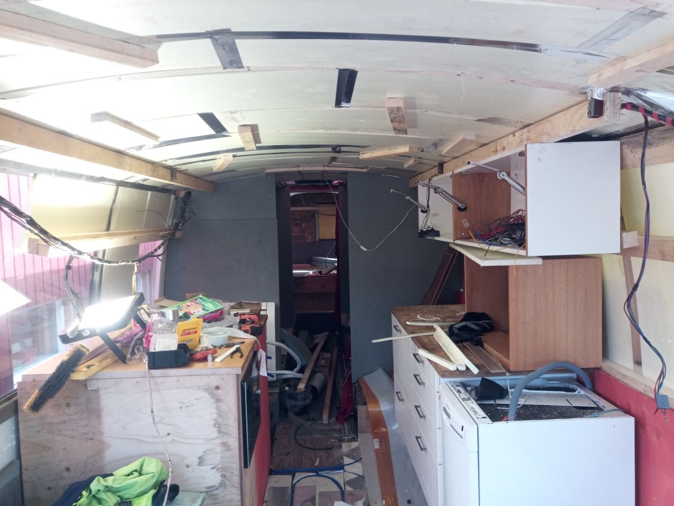 Jos on jo matkailuauto, katsastuksessa kelpaa myös keskeneräinen remontti. Kunhan näyttää siltä että on tulossa sängyt. Oli mulla siis 4 patjaa siellä, mutta ovat väärillä paikoilla. Ja lattia on kipsilevyä tai Finnfoamia, eli siis on mutta ei "oikea". Etuosassa on peri metriä mallina laminaattia...