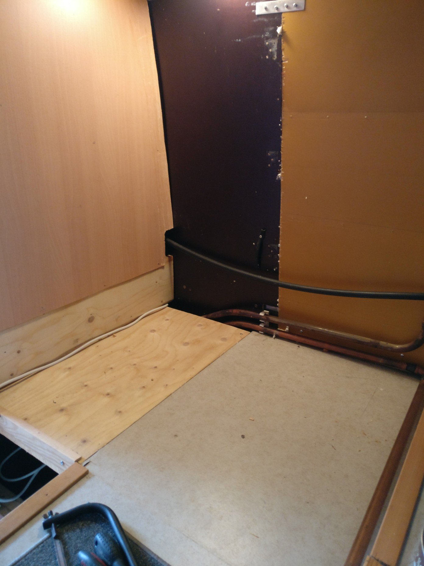 Jatkosuunnitelmina täytyisi valmistaa kaappi tuohon uuden makuukopin päälle. Se ei ole oikeastaan muuta vaille, kuin hyllylevyä ja etuseinää kera ovien. Ajatuksena on tehdä ovista ylöspäin aukeavat, jolloin käyttö on helppoa.