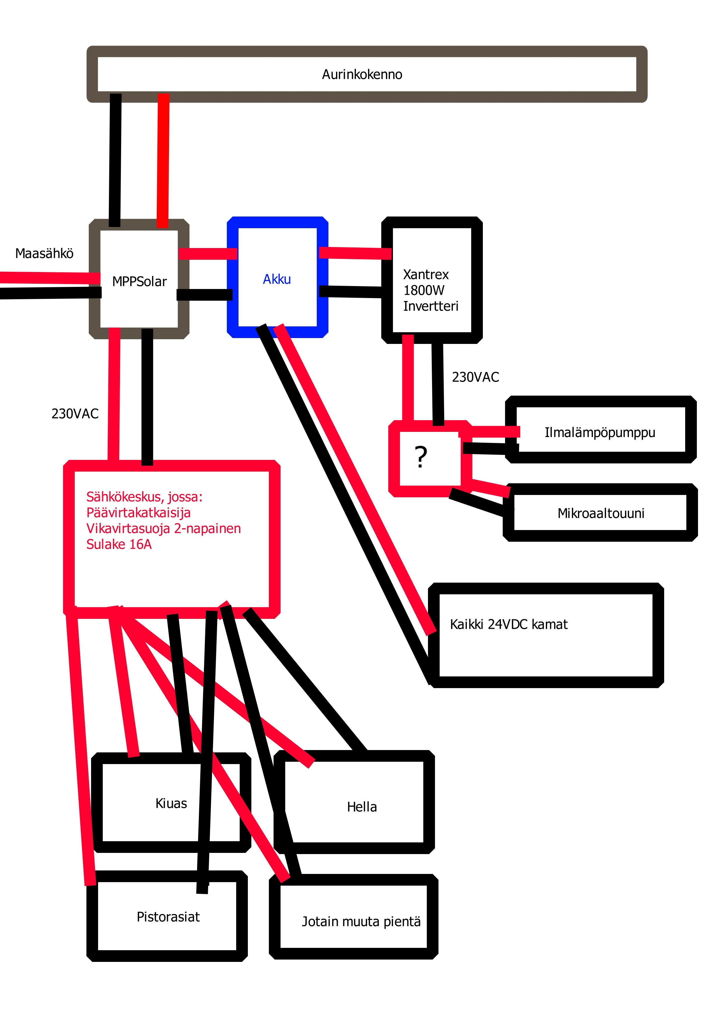 Kötöstin oheisen kaavion. Tarvitaanko tuohon kysymysmerkillä varustetun punaisen neliön kohdalle toinen sähkökeskus? Mulla on tarkoitus laittaa jo tuo autossa ollut häävi invertteri kiinni noihin pariin mainittuun laitteeseen. Autossa ei kyllä mun tietääkseni ollut mitään sähkökeskusta nytkään, oli pari pistorasiaa ihan suoraan invertterin nokassa.