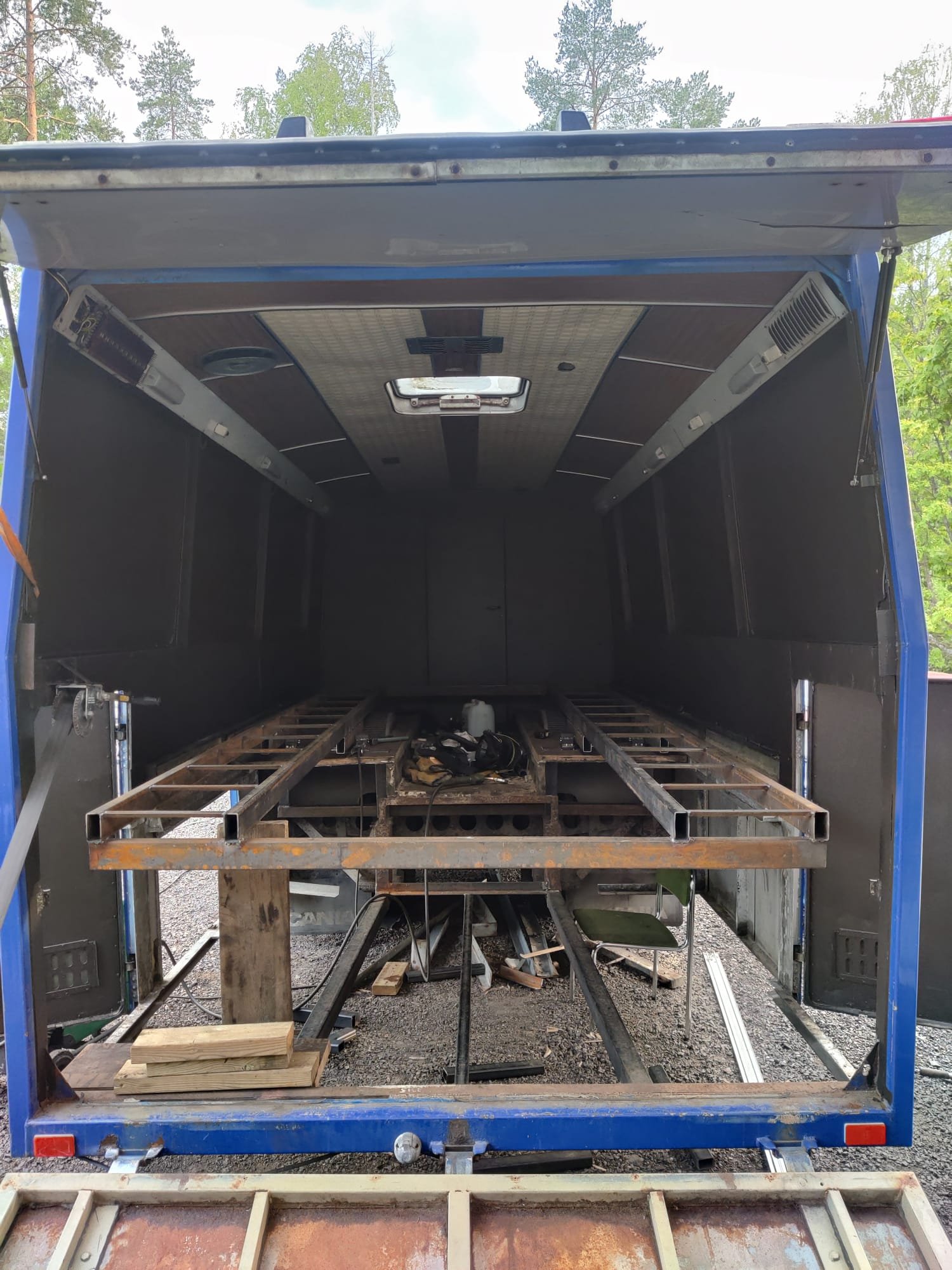 Ongelmana tuossa tuli sitten heti kättelyssä, että kun pitäisi Drifting autoa kuskata, jotka jostakin syystä tuppaa olemaan yleensä aika matalia, niin eihän tuo nykyinen tila oikein siihen käyttöön sopinut. Eihän siinä auttanut, kun purkaa koko perä ja rakentaa uusi pohja.
