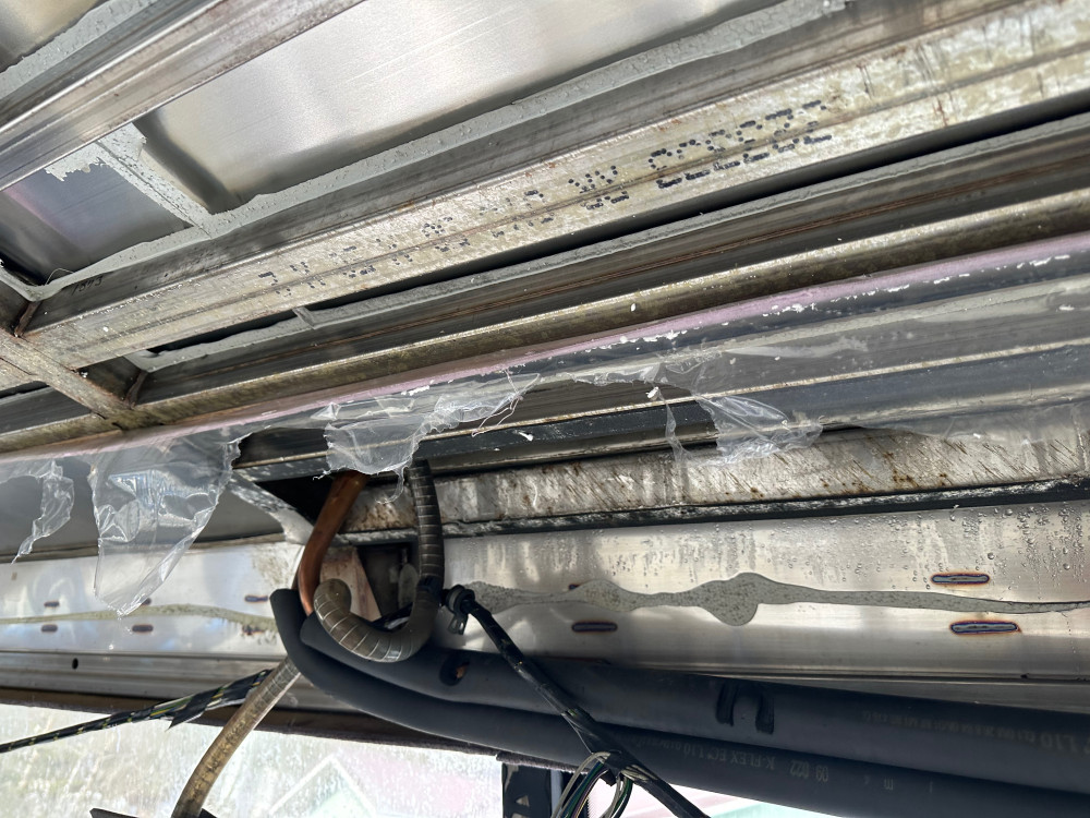 Jos päädyt poistamaan sen ilmastoinnin, se on sekä ruuvattu että liimattu kattoon. Otin sen ite irti aineiden poiston ja putkien katkaisun jälkeen siten, että irrotin ruuvit ja sitten laitoin 6 tn pullotunkin autoon lattialle ja lätkämailan varren tms pystyyn ilmastoinnin koneikkoa vasten katon reiästä. Tunkkiin painetta ja liimat ratkesivat. Kun laitos oli irti autosta, naapurin poika tuli traktorin kanssa viereen ja nakattiin se jööti kauhaan ja sitten liinoilla kiinni ja kauha alas. Ei kannata yrittää heittää sitä ite sieltä pois.