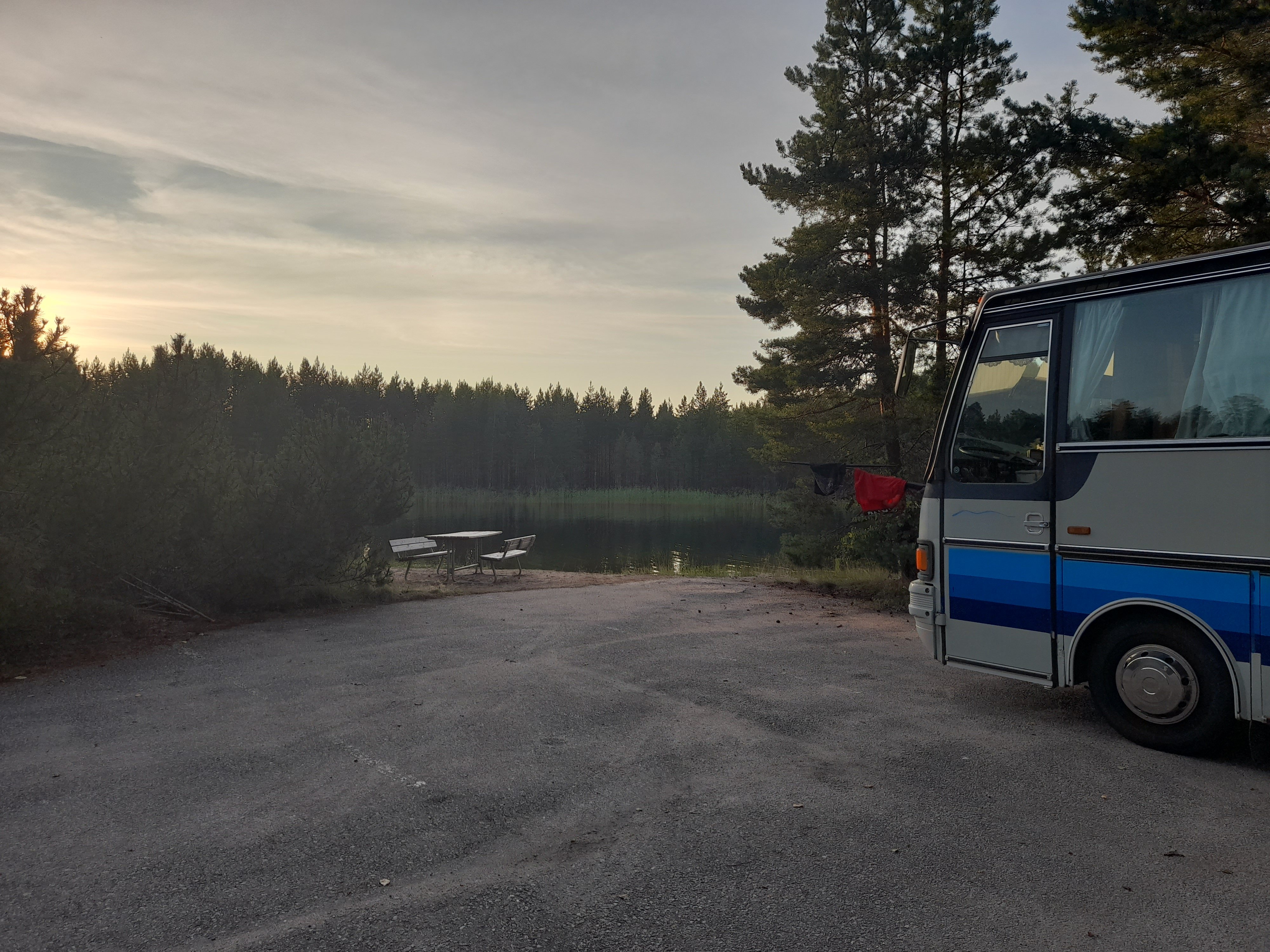 Hetken matkaa ajettua löysimme Tyyrinmäeltä puutavaran purkupaikan. Yövyimme siinä. Hieman mietitytti tuleeko aamusta häätö. Mutta emme olleet tiellä. Peruutimme Hieman taaemmaksi umpitien päähän.