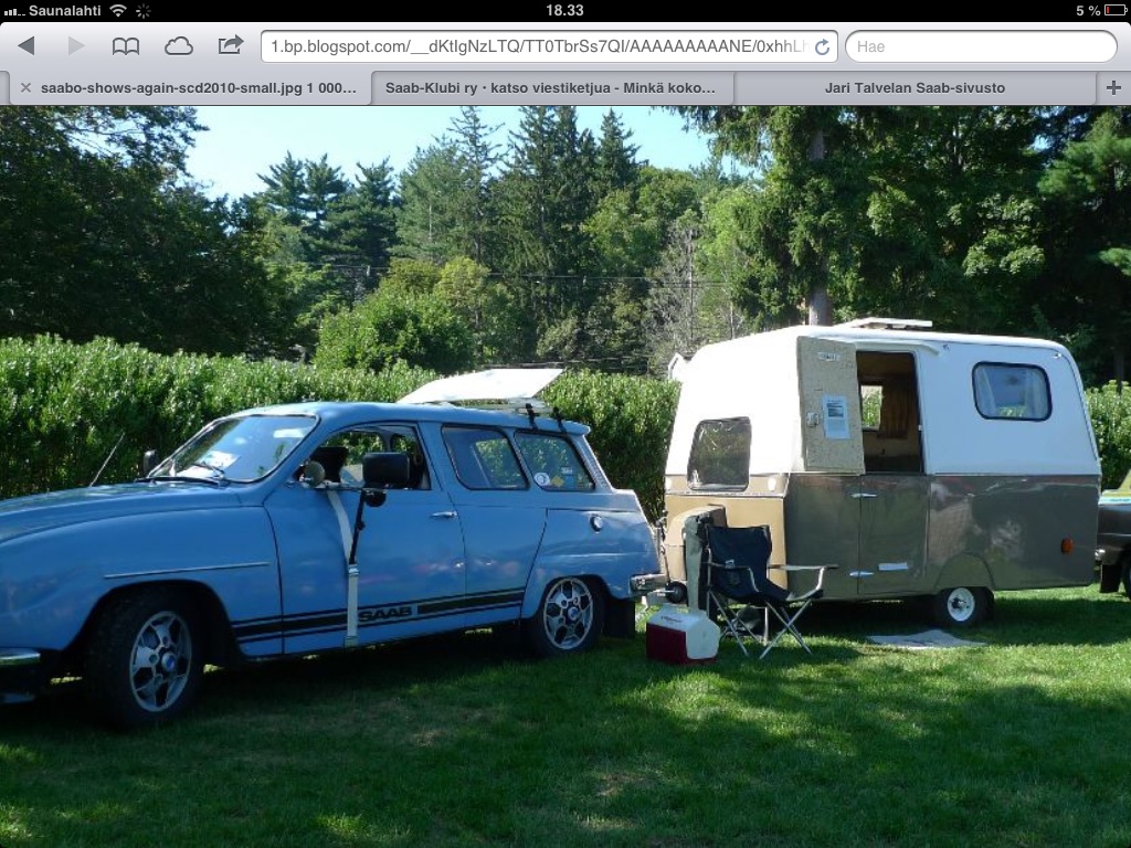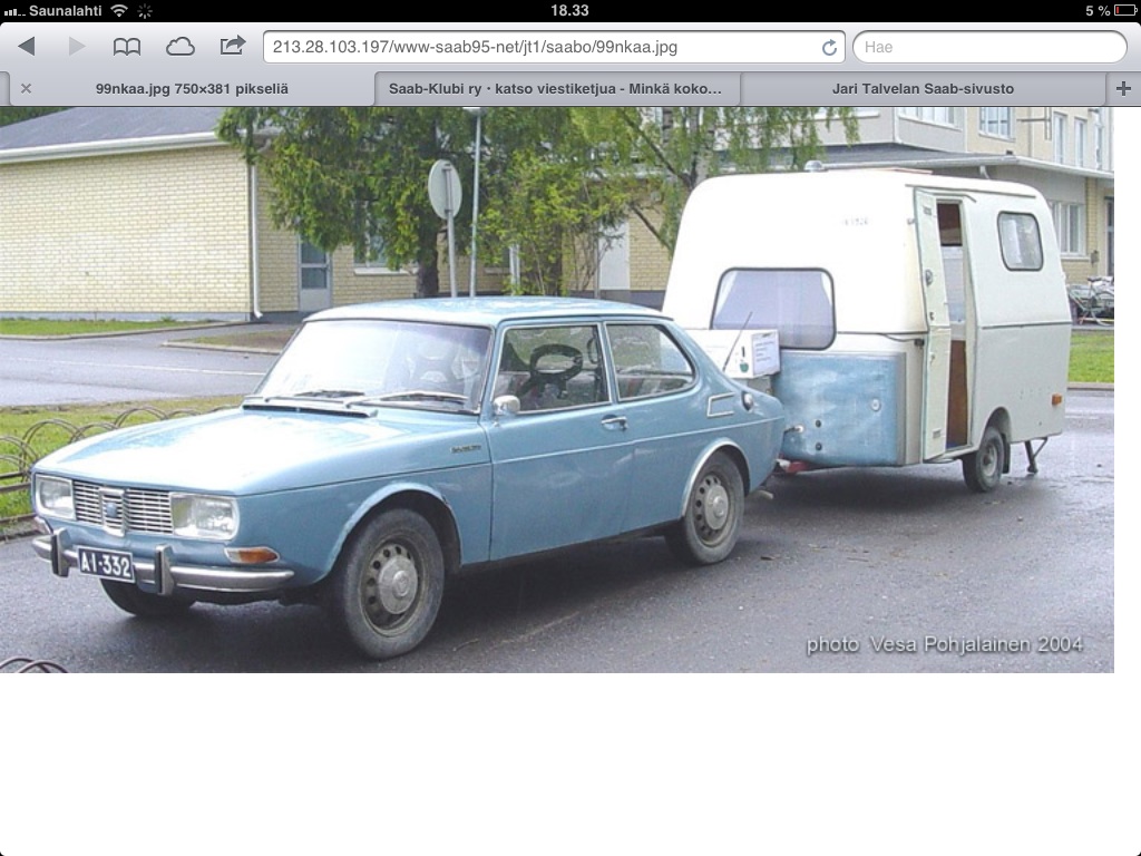 En tiedä minkä sortin hulluus iski mutta ostin "harraste autoksi" vanhan ysipari saabin. -82 mallinen 2-ovinen saapas... Viime kesänä missattiin terva ja ruska-ajot kun ei ollut tarpeeksi vanhaa autoa millä osallistua ajoihin. Auto on suht hyvä kuntoinen, ajettu vasta 250tkm ja ollut koko ikänsä lapissa. Meidän kotoa noin 10 km säteellä löytyy 7 saappia enemmän tai vähemmän purettuna, varaosat ovat halpoja ja välillä jopa ilmaisia. Alkuun oli mielessä että en tee kovin ihmeitä mutta mopo karkasi käsistä... Sisusta vaihdettiin kokonaan, humppa-koneita ainakin riittävästi, omat umpiot pois keulalta ja tilalle tupla-valot (-70 mallin toyota crownista), kattoverhoilu pitää tehdä uusiksi (kullan värisestä plyysistä)... katsoo nyt mitä tuohon vielä keksii. Niin, siitä mainoksesta. Muistelin kuin pahaa unta että aikoinaan oli jossain mainos missä saappi veturina ja asuntovaunu perässä. Mikä oli vaunun merkki??? Vanhaa karavaanaria jututin että siinä olisi ollut ysiparin perässä kantti-mallin solikka, ihan varmaksi ei kuitenkaan osannut sanoa.
